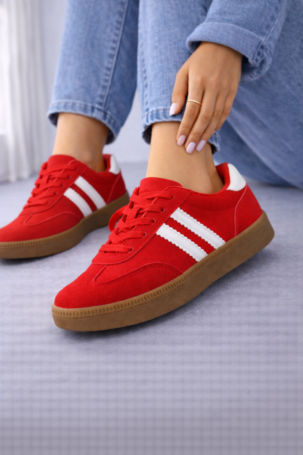 Hermosas zapatillas rojas gamuzadas con detalles en blanco eco cuero